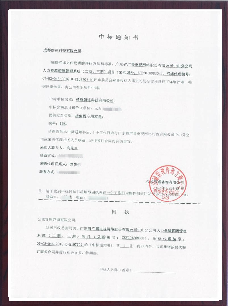 祝賀:朗速軟件中標(biāo)廣東省廣播電視網(wǎng)絡(luò)中山分公司《人力資源薪酬管理系統(tǒng)》,廣東省廣播電視網(wǎng)絡(luò)股份有限公司(簡稱:廣東廣電網(wǎng)絡(luò))是經(jīng)廣東省委、省政府批準(zhǔn),由20家發(fā)起人共同發(fā)起組建的省屬大型國有文化企業(yè),是以廣播電視節(jié)目傳輸為主業(yè)的大型現(xiàn)代化有線廣電網(wǎng)絡(luò)運(yùn)營商。公司目前下轄珠江數(shù)碼集團(tuán)有限公司、廣東有線廣播電視網(wǎng)絡(luò)股份有限公司(直屬公司)、19個地市分公司和68個縣級分公司,現(xiàn)有在職人員9100多人(含派 遣制人員)。用戶規(guī)模達(dá)1300多萬戶,總資產(chǎn)規(guī)模達(dá)150多億元。用戶規(guī)模、資產(chǎn)總額均位居全國同行業(yè)前茅。公司下一步還將全面推進(jìn)全省廣電網(wǎng)絡(luò)資源整合,實(shí)現(xiàn)"全省一張網(wǎng)"的戰(zhàn)略目標(biāo),成為資產(chǎn)和經(jīng)營收入超過200億元,有線電視用戶達(dá)到1900萬戶,在全國具有強(qiáng)大競爭力和影響力的知名骨干文化企業(yè)。2012年5月18日,入選第四屆中國“文化企業(yè)30強(qiáng)”