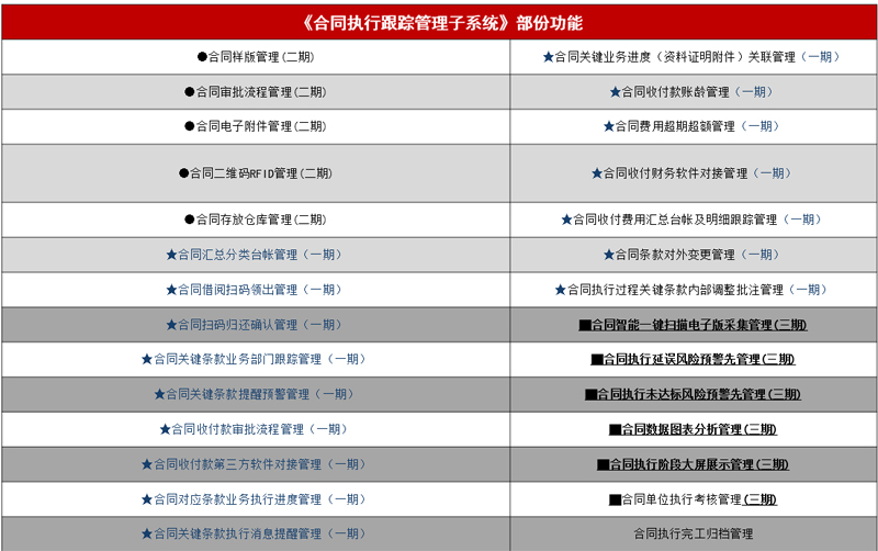 廣東廣電中山網(wǎng)絡(luò)公司與我公司簽定合同管理跟蹤管理平臺,主要功能包括如下: 1、合同匯總分類臺賬管理、 2、合同借閱掃碼領(lǐng)出管理、 3、合同掃碼歸還確認管理、 4、合同關(guān)鍵條款業(yè)務(wù)部門跟蹤管理、 5、合同關(guān)鍵條款提醒預(yù)警管理、 6、合同收付款審批流程管理、 7、合同收付款第三方軟件對接管理、 8、合同對應(yīng)條款業(yè)務(wù)執(zhí)行進度管理、 9、合同關(guān)鍵條款執(zhí)行消息提醒管理、 10、合同收付款賬齡管理、 11、合同費用超期超額管理、 12、合同收付財務(wù)軟件對接管理、 13、合同收付費用匯總臺賬及明細跟蹤管理、 14、合同條款對外變更管理、 15、合同執(zhí)行過程關(guān)鍵條款內(nèi)部調(diào)整批注管理